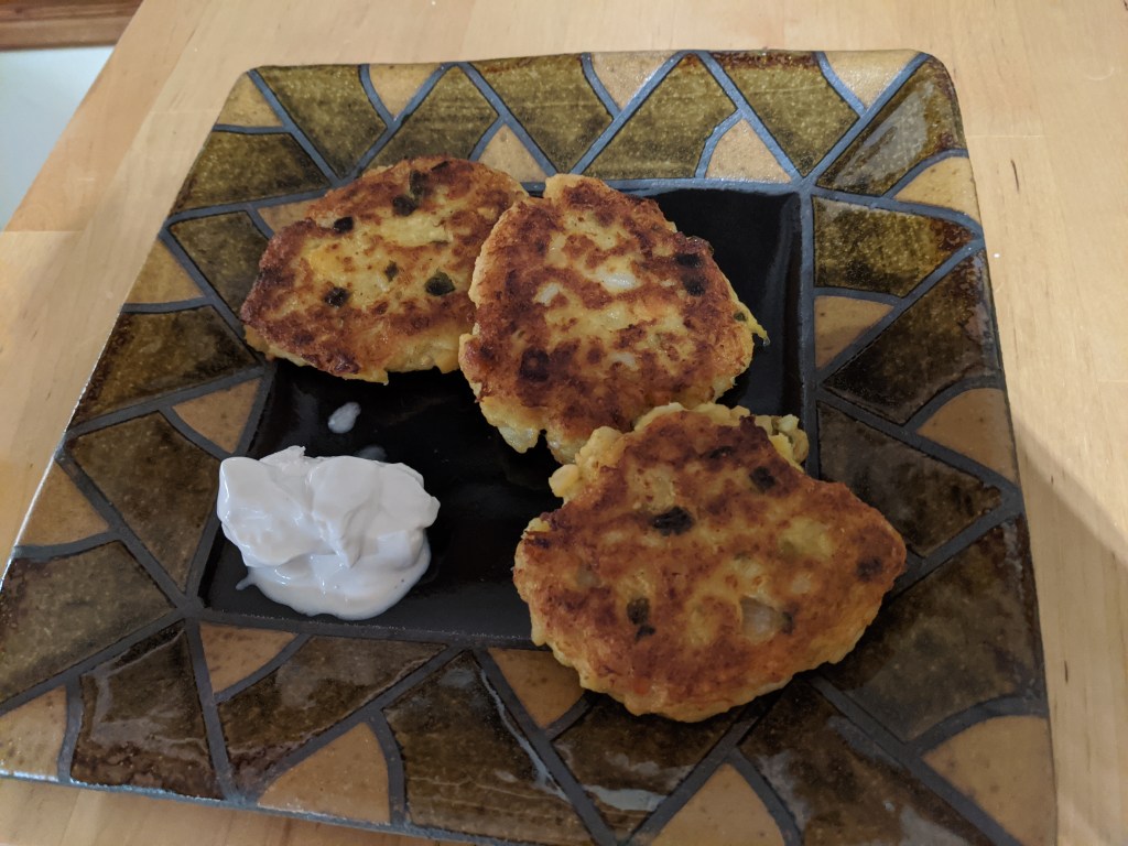 Heat some oil in a pan and shape the batter into flat balls. I found that making them really thin was key to getting a nice texture. If they are thick, they stay pretty smushy in the middle. Shape them as thin as you can with your hands, and then flatten them with the spatula once they are in the pan. Cook until desired doneness, then flip and cook other side as well. I preferred a darker brown color vs a golden brown, it held together better and added more texture. Add more oil as needed.